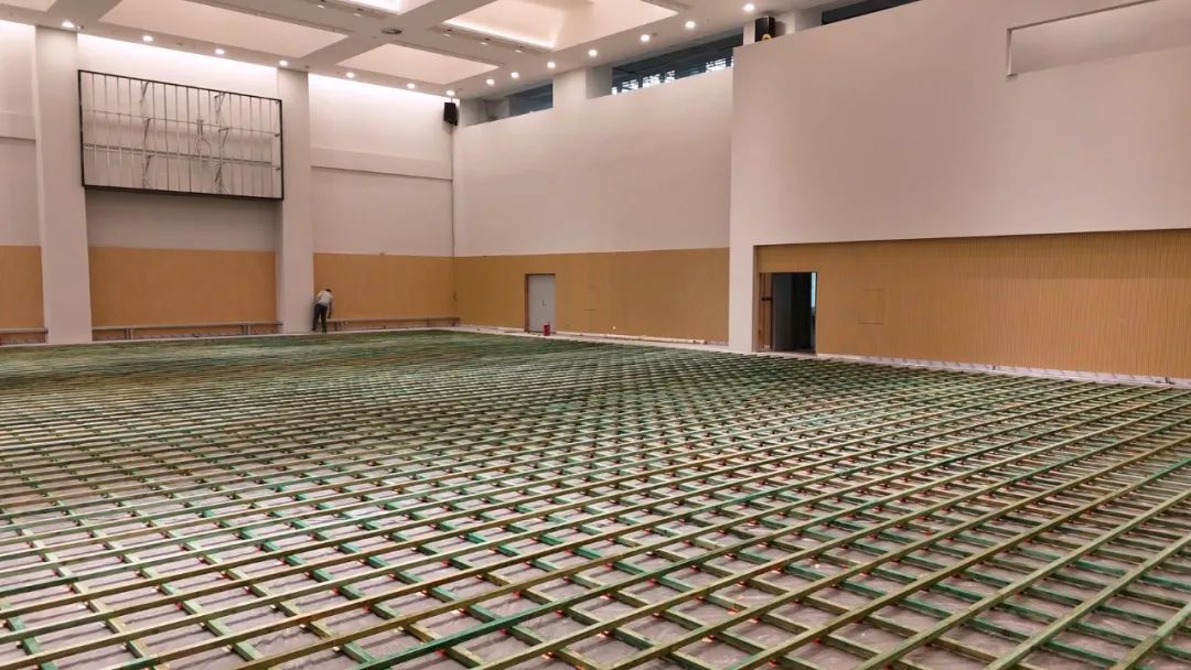 篮球馆木地板安装工程量为1300㎡,目前基层木龙骨、基层板安装已完成45%。