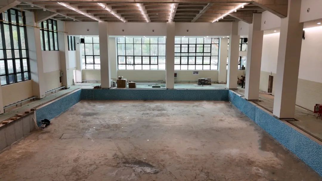 游泳池马赛克贴装工程量为850㎡,目前整体已完成40%。