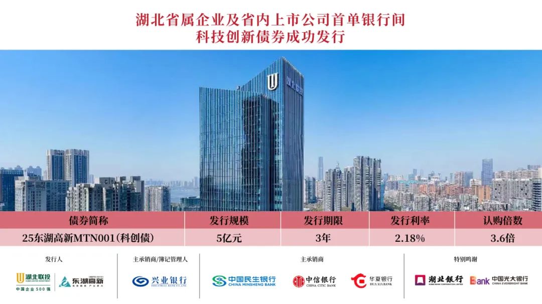 6月12日,在中国人民银行武汉分行、武汉东湖新技术开发区金融工作局和九游体育财务管理部(资金中心)的支持和指导下,武汉东湖高新集团股份有限公司(以下简称“东湖高新集团”)成功发行2025年度第一期科技创新债券,系湖北省属企业及省内上市公司首单银行间科技创新债券。