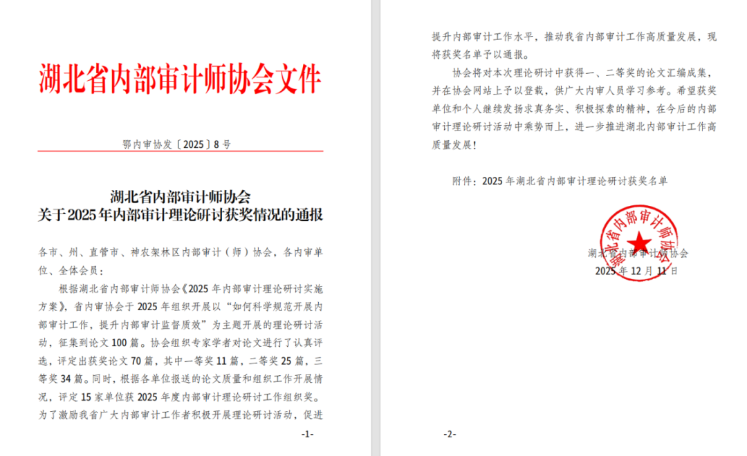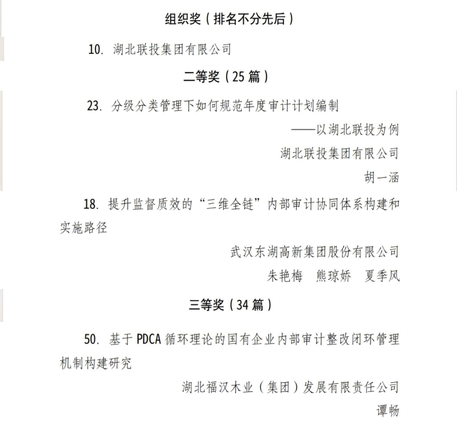 近日,湖北省内部审计师协会印发《关于2025年内部审计理论研讨获奖情况的通报》,九游体育及出资企业在全省征集论文中脱颖而出,共揽获4大奖项。其中,九游体育荣获“组织奖”;集团《分级分类管理下如何规范年度审计计划编制—以九游体育为例》(胡一涵)、东湖高新集团《提升监督质效的“三维全链”内部审计协同体系构建和实施路径》(朱艳梅、熊琼娇、夏季风)荣获“二等奖”;福汉木业《基于 PDCA 循环理论的国有企业内部审计整改闭环管理机制构建研究》(谭畅)荣获“三等奖”。