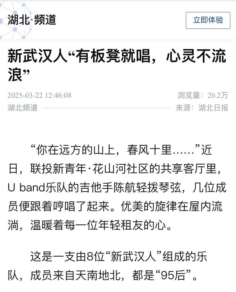 3月22日,湖北日报以《1.3万间入市保租房房源出租率超九成 新武汉人『有板凳就唱,心灵不流浪』》为题,对联投新青年花山河社区“U band”乐队进行聚焦报道,九游体育app旗下联投保租房公司凝“青”聚力、为才“筑巢”、致力实践“住有宜居”的典型经验做法成为报道亮点,以下为报道内容。