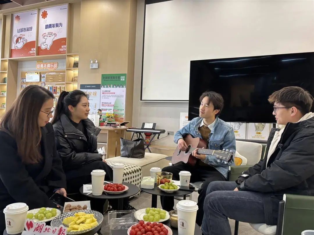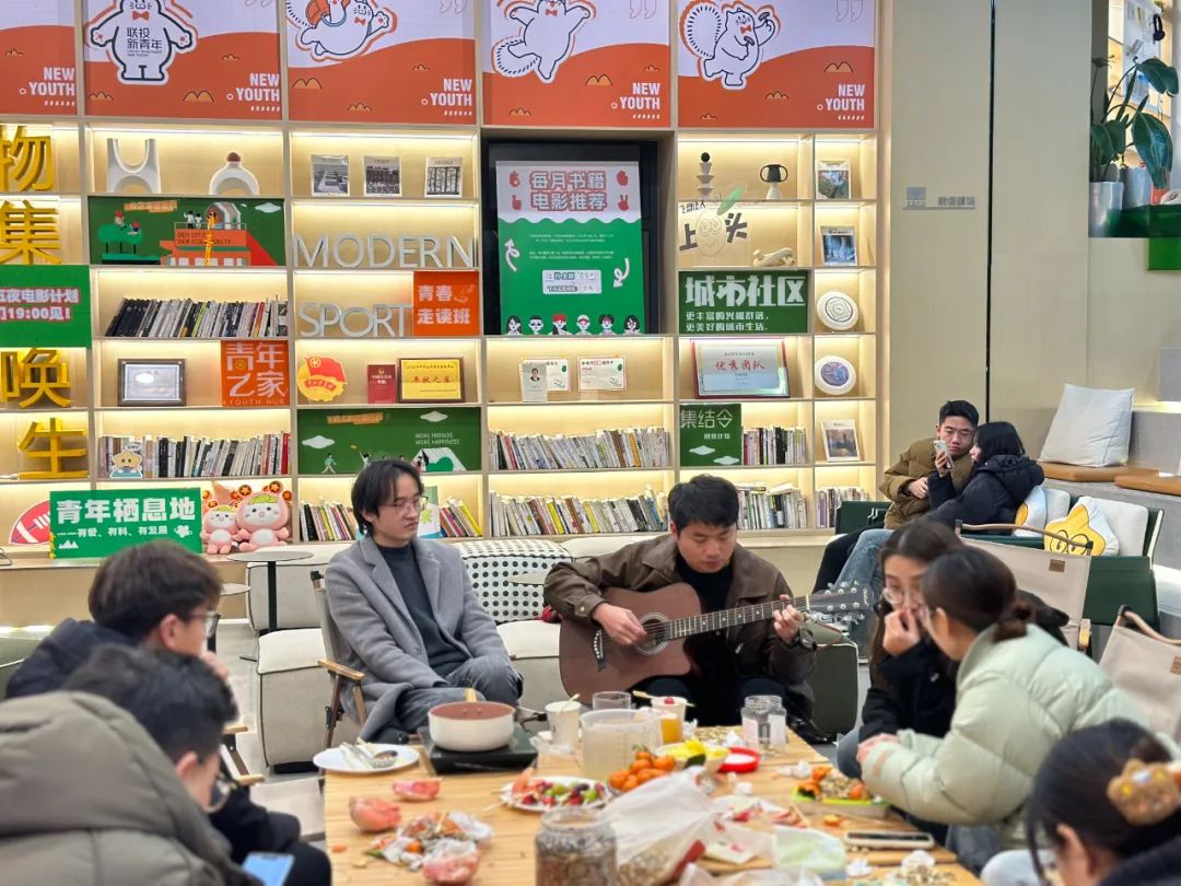 “你在远方的山上,春风十里……”3月15日,联投新青年·花山河社区的共享客厅里,U band乐队的吉他手陈航轻拨琴弦,几位成员便跟着一起哼唱了起来。优美的旋律在屋内流淌,温暖着每一位年轻租友的内心。