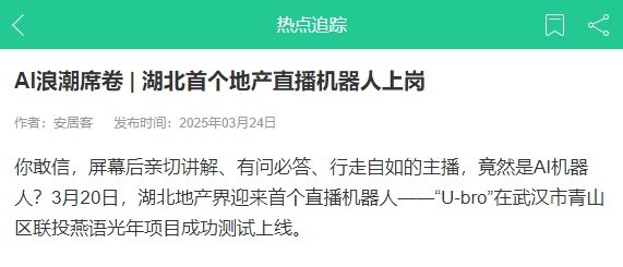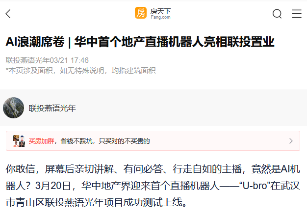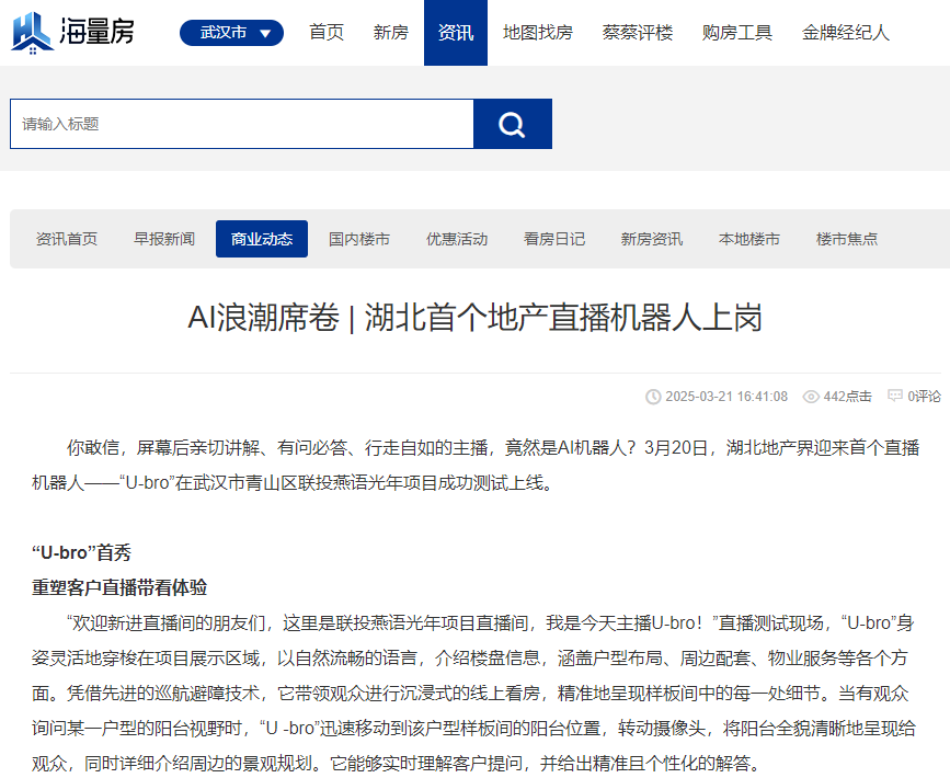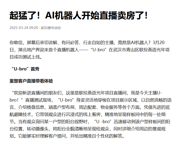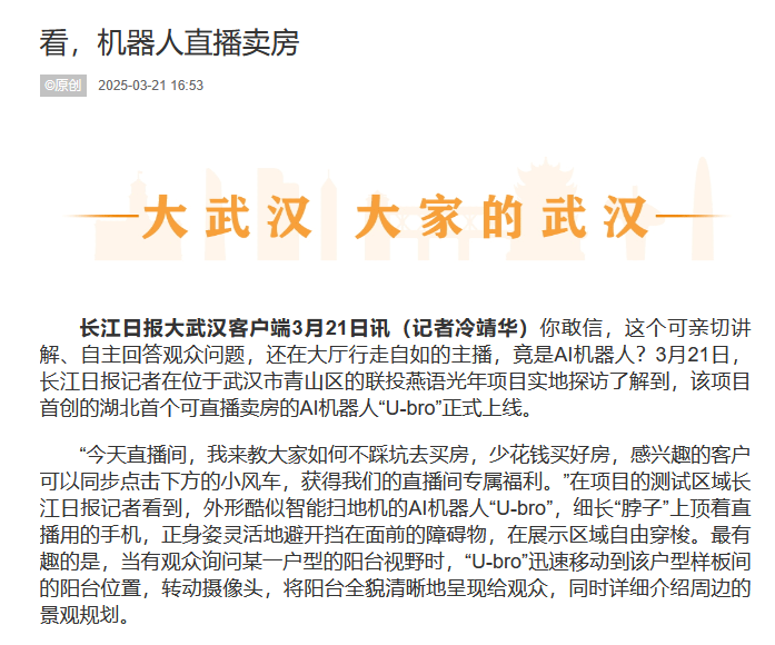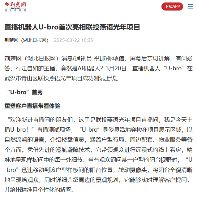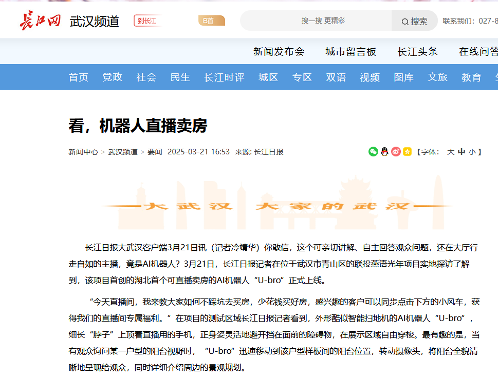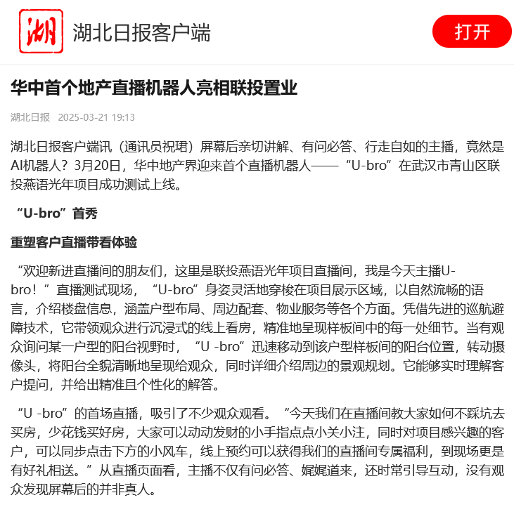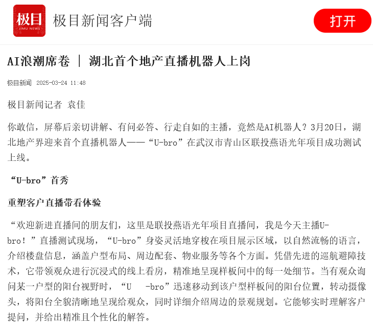 近日,联投燕语光年迎来首个直播机器人“U-bro”,凭借其拟人化交互、全场景覆盖和7×24小时无休服务,迅速引发行业内外的广泛关注。在“新质生产力”成为经济发展核心动能的当下,联投置业以技术创新为支点,利用人工智能技术深度赋能实体经济,数字营销驱动企业降本增效,实现了自身高质量发展的突破,更为地产行业与市场注入新动能。其获得湖北日报、长江日报、荆楚网、长江网、极目新闻等省市级主流媒体,以及今日头条、房天下、安居客、海量房等行业媒体报道及转载,以下为媒体报道转载截图: