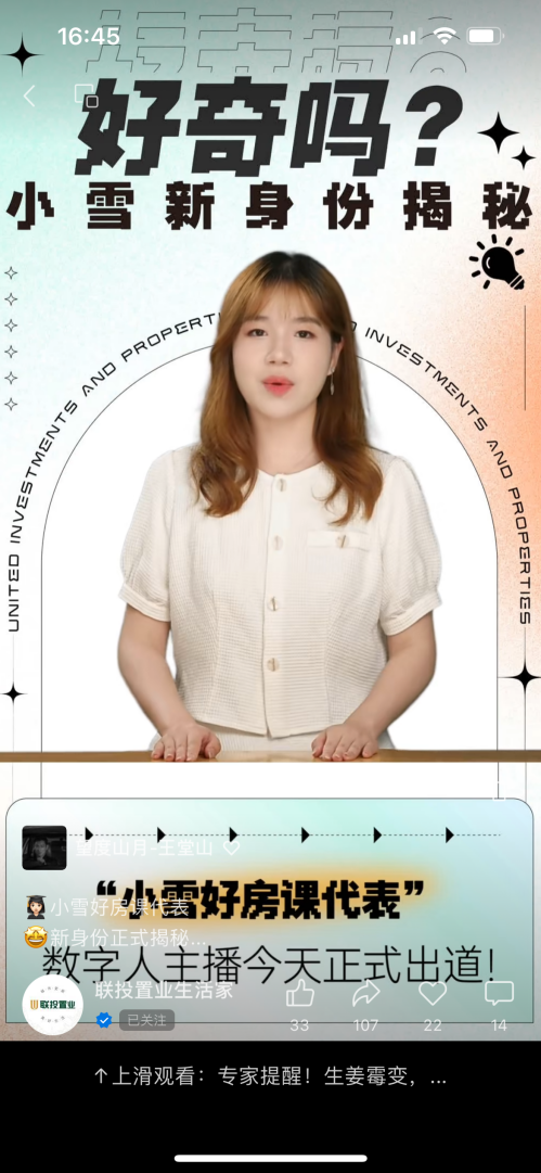 当敏锐洞察到数字营销的重要性,联投置业开启“短直双开”1.0到2.0的迭代优化,率先搭建“1+14+N”三级线上获客矩阵,开展常态化短视频和直播运营,拓宽线上流量通路。同时,搭建线上获客团队,由平台负责线上内容生产、方法沉淀以及一线赋能;项目承载内容的属地化加工改造、短视频拍摄、直播获客,从质与量双维度发力,确保优质视频内容的持续产出。截至2024年底已积累超1400条脚本,发布8000余条短视频作品,累计曝光超10亿,吸引客户咨询超2万组。此后,又结合真实人物形象,采用AI和语音克隆技术打造“小雪好房课代表”数字人主播,秒级回复客户问题,提供“销冠级”服务,精准响应用户需求。截至目前,联投置业线上自获客成交占比已超过10%,有效驱动企业降本增效。