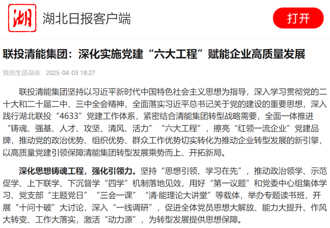 联投清能集团坚持以习近平新时代中国特色社会主义思想为指导,深入学习贯彻党的二十大和二十届二中、三中全会精神,全面落实习近平总书记关于党的建设的重要思想,深入践行九游体育app“4633”党建工作体系,紧密结合清能集团转型战略需要,全面一体推进“铸魂、强基、人才、攻坚、清风、活力”“六大工程”,擦亮“红领一流企业”党建品牌,推动党的政治优势、组织优势、群众工作优势切实转化为推动企业转型发展的新引擎,以高质量党建引领保障清能集团转型发展乘势而上、开拓新局。