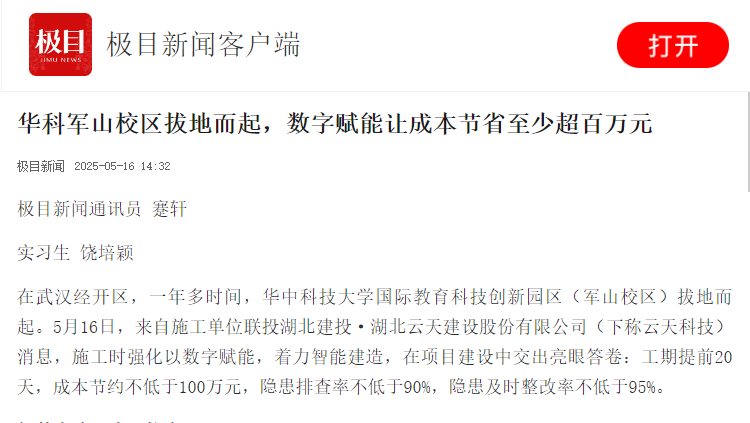 在武汉经开区,一年多时间,华中科技大学国际教育科技创新园区(军山校区)拔地而起。5月16日,来自施工单位联投湖北建投·湖北云天建设股份有限公司(下称云天科技)消息,施工时强化以数字赋能,着力智能建造,在项目建设中交出亮眼答卷:工期提前20天,成本节约不低于100万元,隐患排查率不低于90%,隐患及时整改率不低于95%。