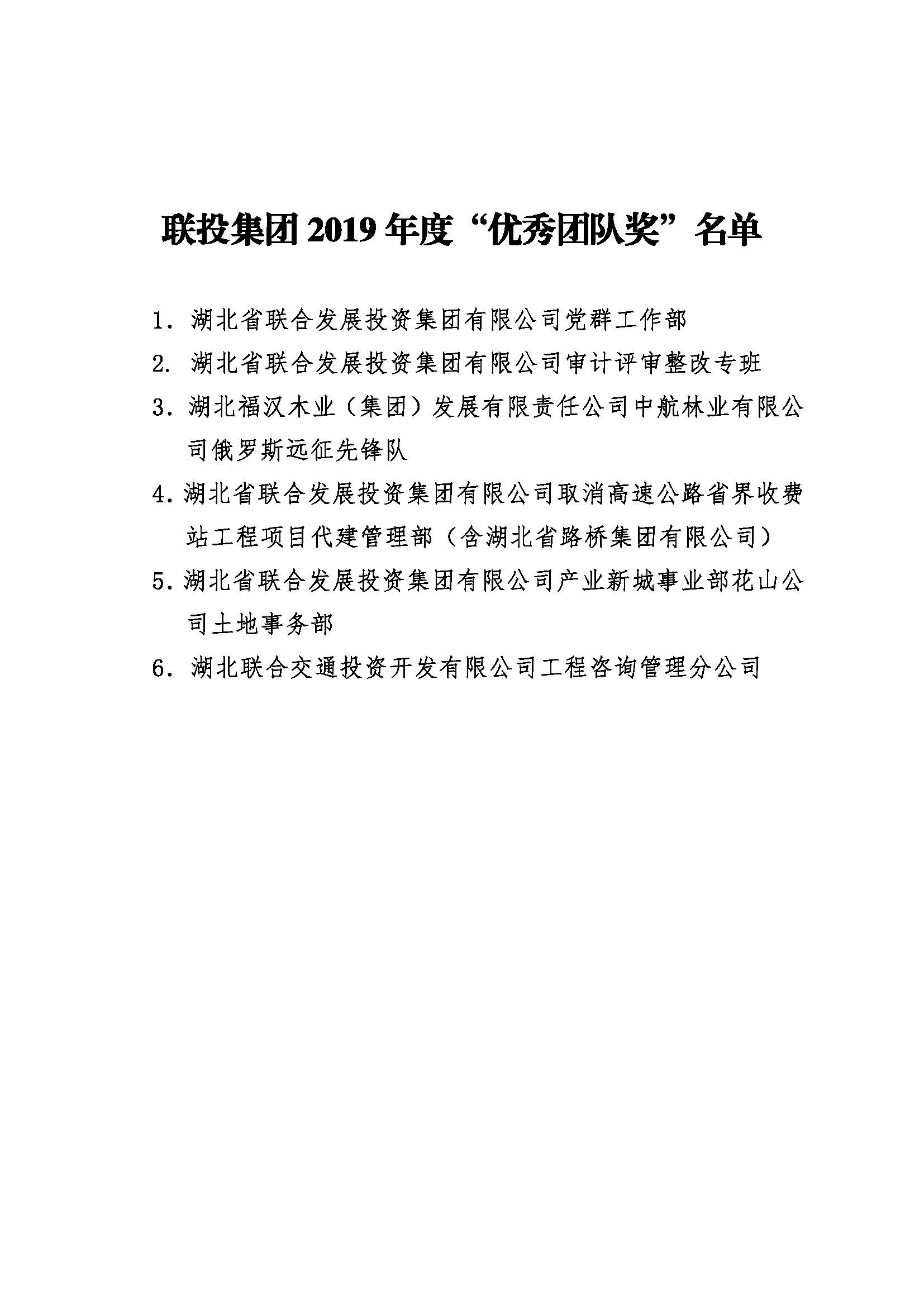 为树立企业先进典型,表彰在2019年度经营管理工作中做出突出贡献的先进集体和先进个人,根据《关于开展2019年度评优评先工作的通知》(鄂联投人〔2019〕200号)安排,本次评优评先工作经过提名申报、网络投票、现场投票环节,联投集团党委针对 “杰出经营管理团队奖”“联投年度人物奖”“优秀团队奖”“优秀经理奖”“优秀员工奖”“新人成长奖”已进行评审,现将评审通过获奖人员(名单附后)进行公示。